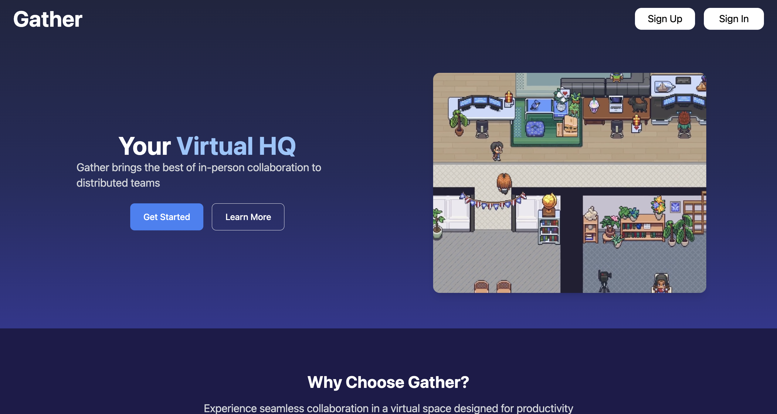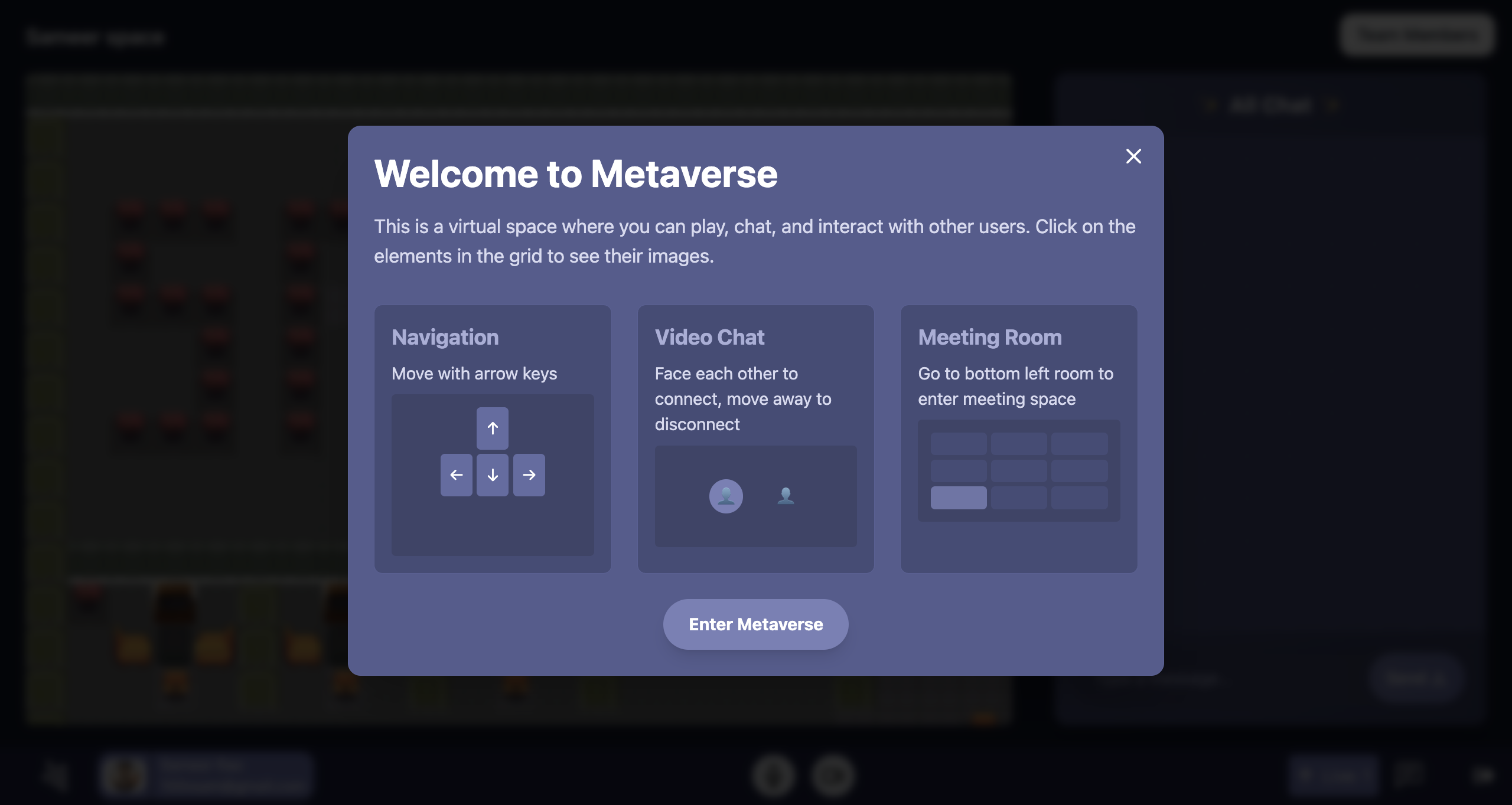 The 2D Metaverse is an immersive virtual environment accessible directly via web browsers. It blends real-time communication, avatar-driven exploration, and spatial collaboration into one seamless experience. Designed to feel like a "virtual office" or "hangout space," users can move around rooms, talk with others via video calls, and experience a persistent shared environment.